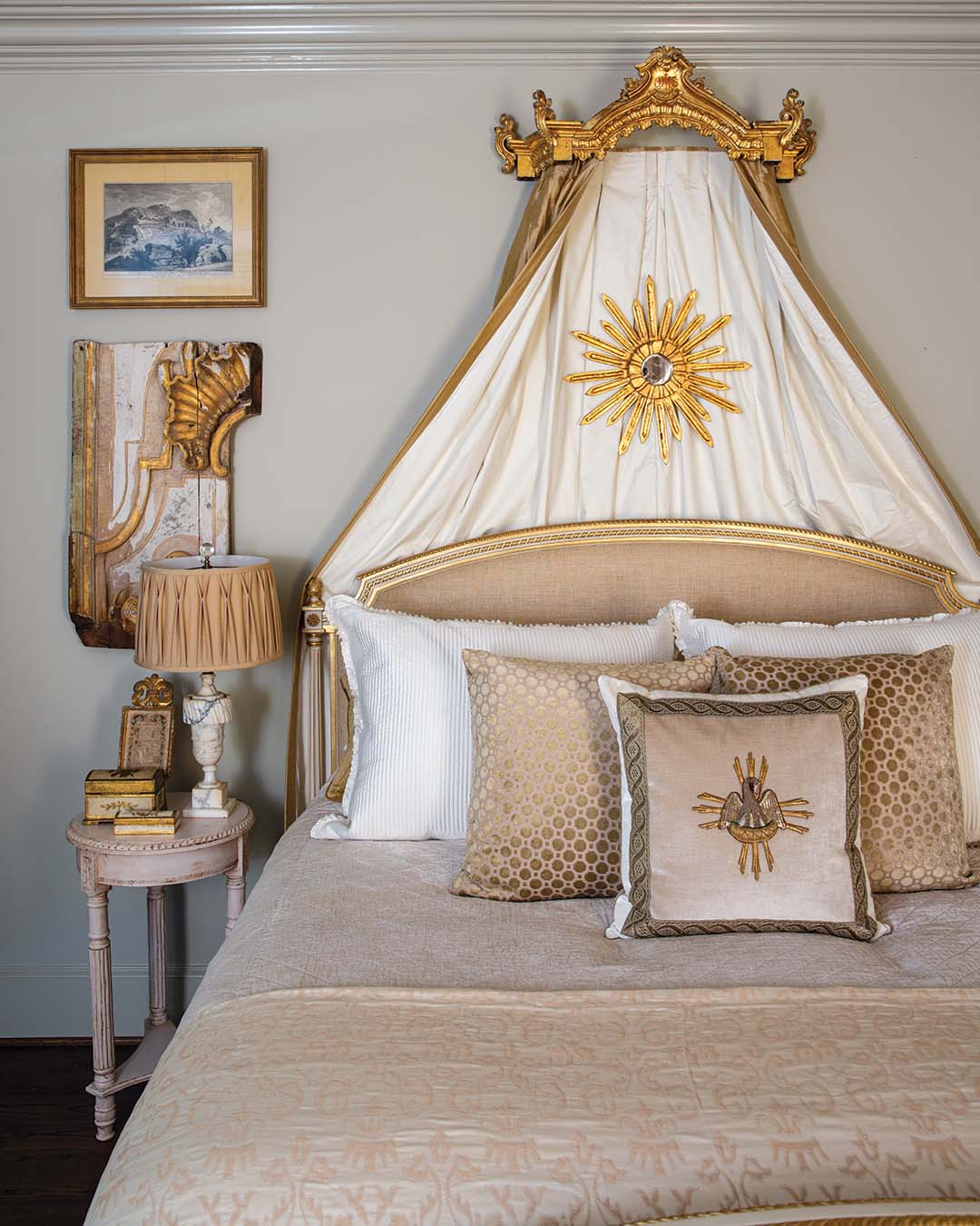 Layers of luxurious textiles in the primary bedroom create an opulent oasis to return to each evening. From the bed cornice—a repurposed relic from a cathedral in France—to the starburst mirror and remnants of a Paris opera house that grace the wall, there’s no shortage of French touches in this dreamy retreat. A Busatti coverlet tops Lili Alessandra bedding, complementing the space’s sophisticated neutral scheme.