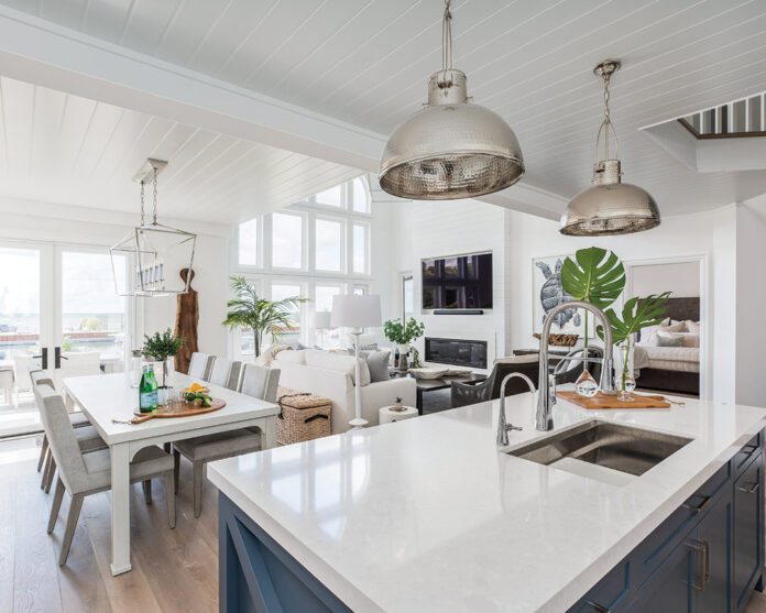 On the sparkling shores of the Georgian Bay in Collingwood, Ontario, Canada, the views from this vacation home were as stunning as ever, but the family of five with three teenage sons was starting to outgrow it. Rather than move on to something new, they teamed up with Aspen & Ivy Interiors to find an imaginative way to work with what they had, expanding the livable space while modernizing the look using the setting as their muse. “Their location was spectacular,” says Catherine Staples, principal designer at Aspen & Ivy. “They can dock their boat out front. Waterfront is a premium and hard to get, so they decided to stay and renovate.”