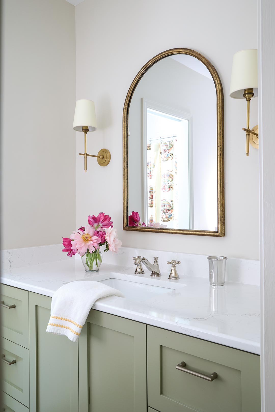 The updated vanity and cabinets in the guest bathroom are painted to match the kitchen and family rooms, creating a cohesive palette throughout the home.
