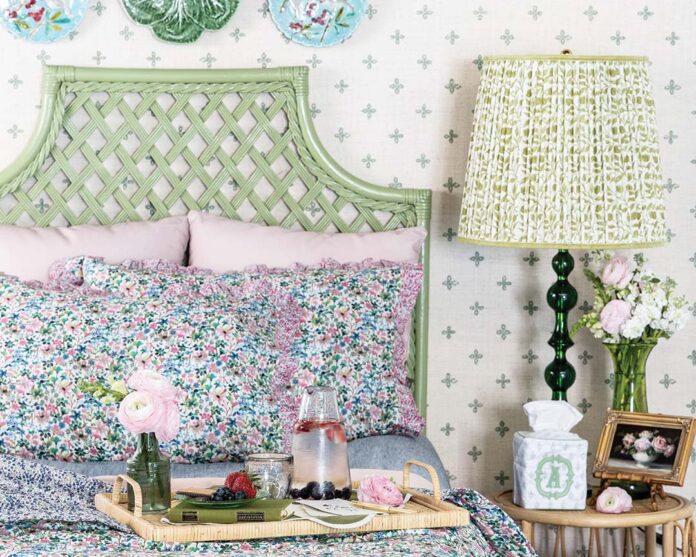 Wallpaper from Thibaut, finestwallpaper.com. Headboard from Mainly Baskets, mainlybaskets.com. Bedding from Coco & Wolf, cocoandwolf.com. Tissue box cover from Weezie, weezietowels.com. Lamp from Pooky, us.pooky.com. Bed tray from Serena & Lily, serenaandlily.com. Carafe and note cards from Cultiverre, cultiverre.com. Art by CE Fine Art Studio, carolinaelizabeth.com.