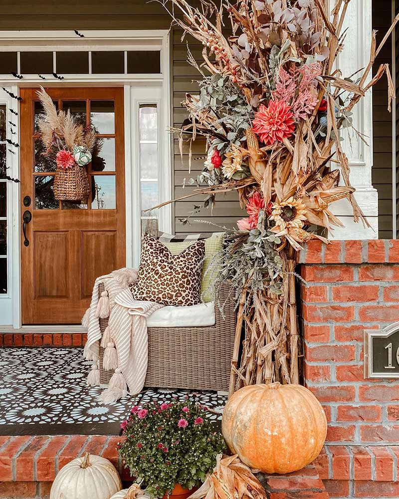 Mums will always be a fall favorite, but don’t hesitate to throw a few unexpected elements in with your home’s exterior display. Tucked among the classic corn stalks, eucalyptus, sunflowers, dahlias, and more add color and depth to this porch’s display. For an unexpected touch, a leopard-print throw pillow cozies up a chair, extending an invitation to curl up with a cup of cider and watch the leaves change!