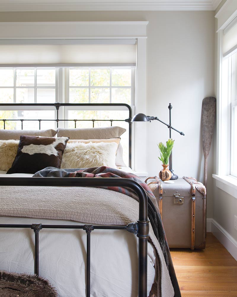The home’s bedrooms up the coziness factor with welcoming neutrals, rich gray tones, and layered textures. Clean lines paired with details like cowhide throw pillows and varnished wood surfaces maintain the masculine character found in every room, keeping the spaces comfortable for everyone.