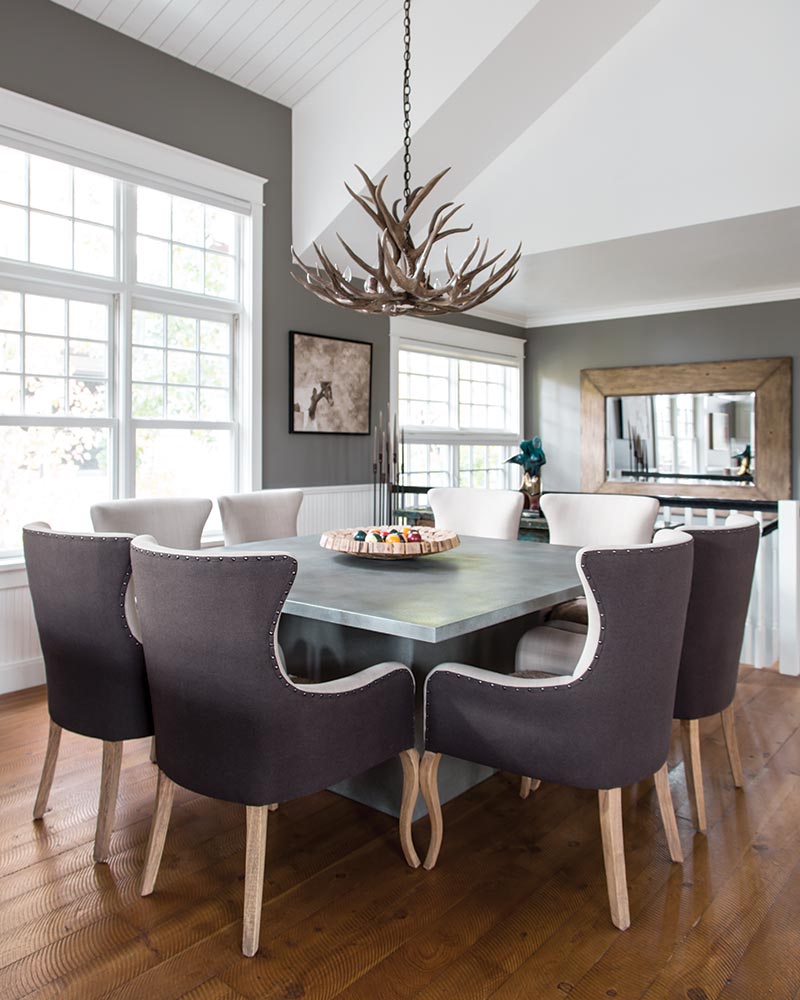 Touches of natural materials, like the leather club chair and twig table that sit not far from the hearth, give a nod to the home’s stunning surroundings. But the farmhouse elements in the design find their balance in refined, contemporary touches, like the goat hide chairs that sit in the dining room. “When I found those at the Las Vegas, Nevada, market, I fell in love with the balance of their masculine materials and feminine legs,” Kate says, noting the way the French legs counterbalance the square, steel table.
