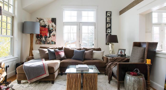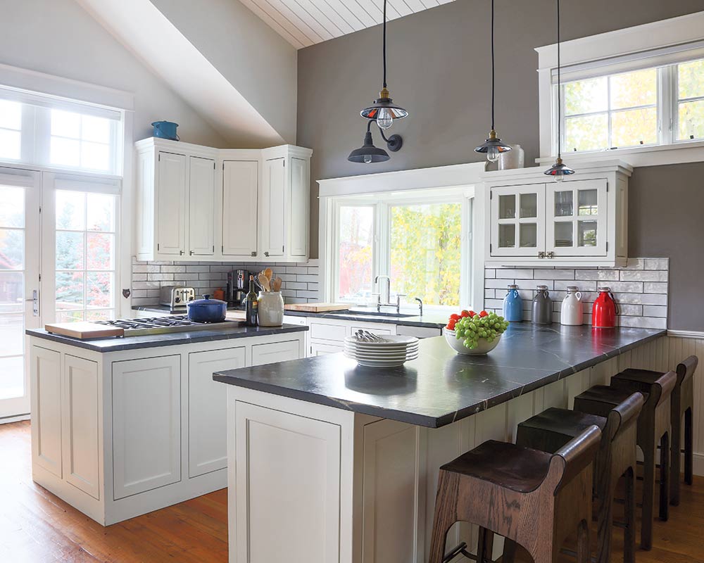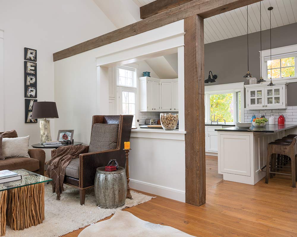 To accomplish that, Kate and her team incorporated mountain-style elements into a space that maintained the comfortable airiness of farmhouse design. From the stone fireplace in the living room to the wooden ceiling beams throughout the home, rustic details are balanced by vaulted ceilings and stretches of white surfaces.