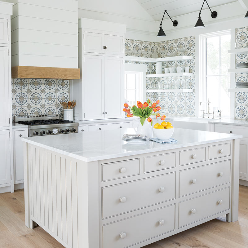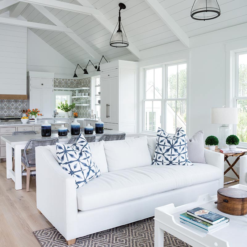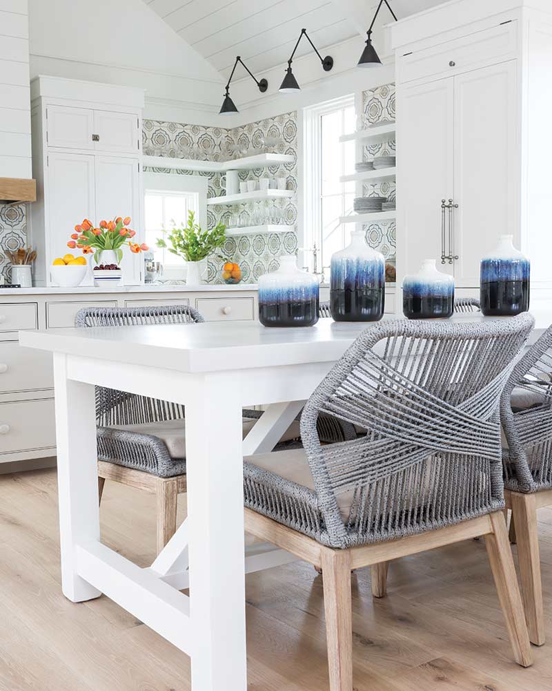 But Lisa didn’t forgo color completely. Strokes of navy blue in the décor pop against the white background without distracting from the view, and the dark, industrial lines of hanging lights draw down the height of the vaulted ceiling. Hand-painted terra cotta tiles inject a splash of cheerful tones into the kitchen, which features an oversize island, floating shelves, and an abundance of storage. “The kitchen is so simple, and I knew I wanted a little bit of navy and taupe and gray,” Lisa says of the tile choice.